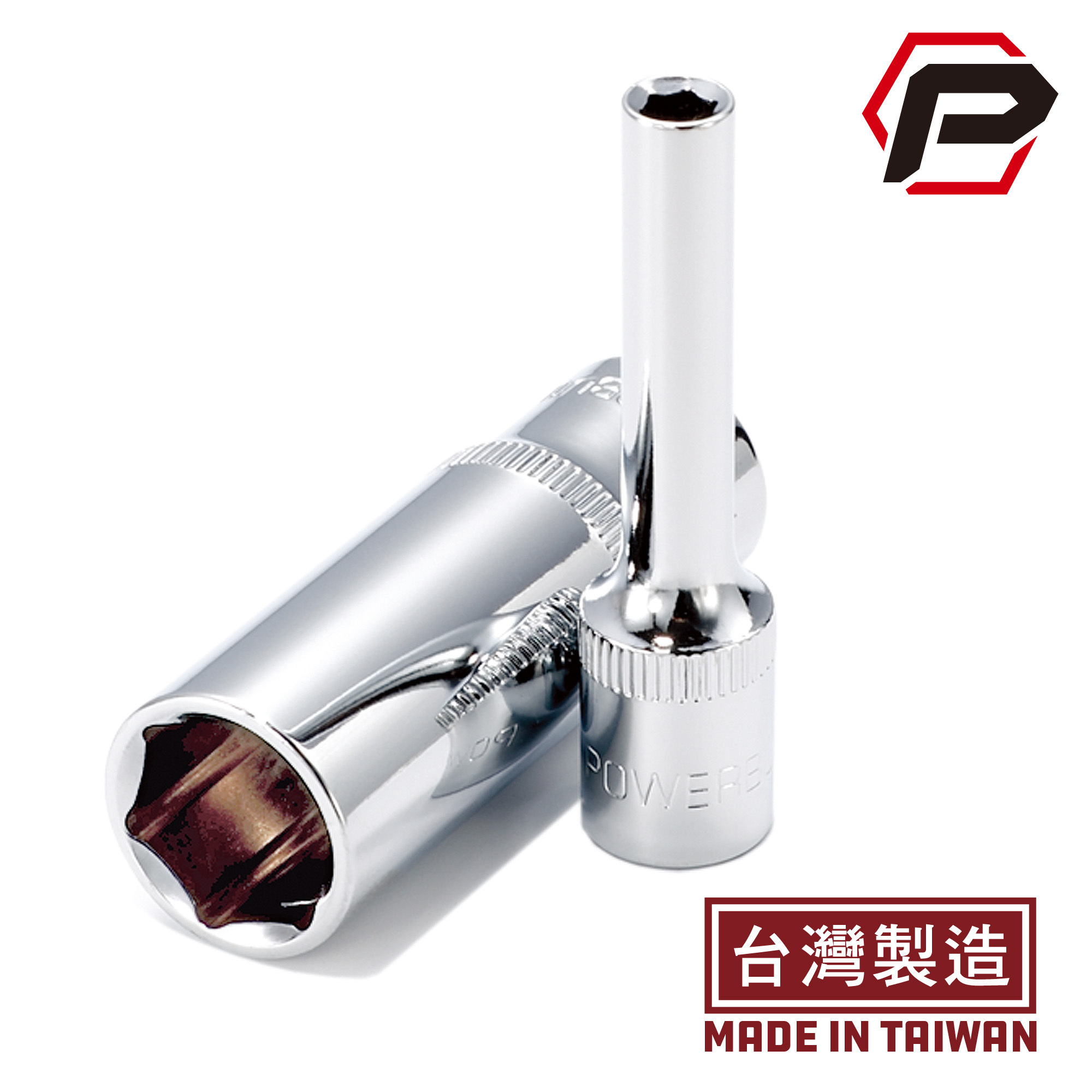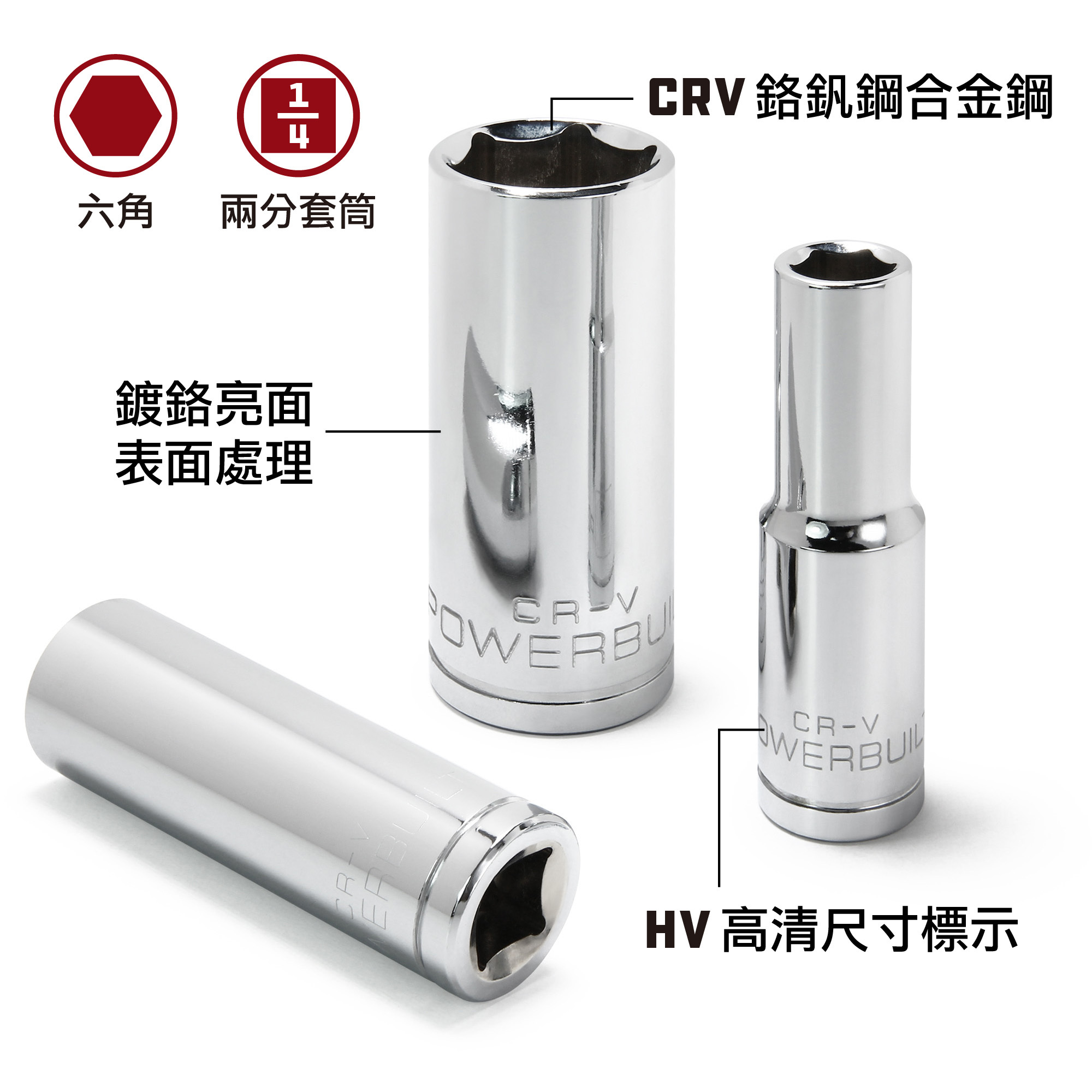 Powerbuilt 兩分六角加長套筒為台灣製造,通過美國ANSI與歐洲DIN工具標準測試,品質保證,產品兩年保固。套筒為工業等級鉻釩鋼(CR-V)材質,兼具高硬度以及高韌性特性,透過精密多道熱處理,使套筒可承受高扭力以及擁有使用超長壽命。套筒表面採工業等級鏡面拋光鍍鉻處理,擁有抗刮耐磨以及抗油汙等特性。