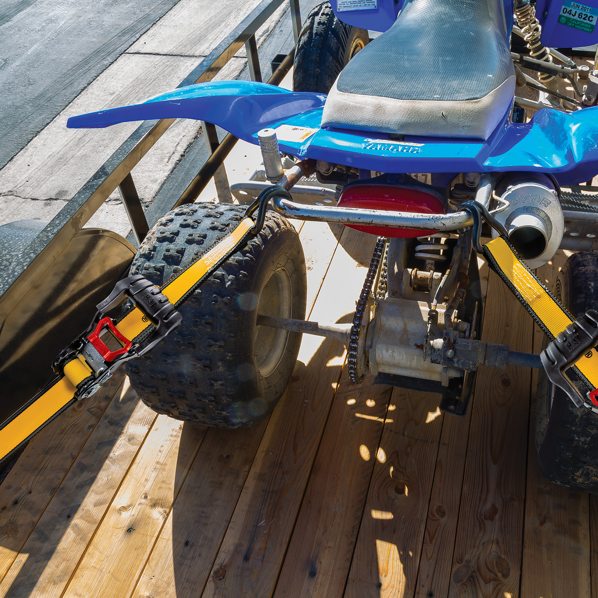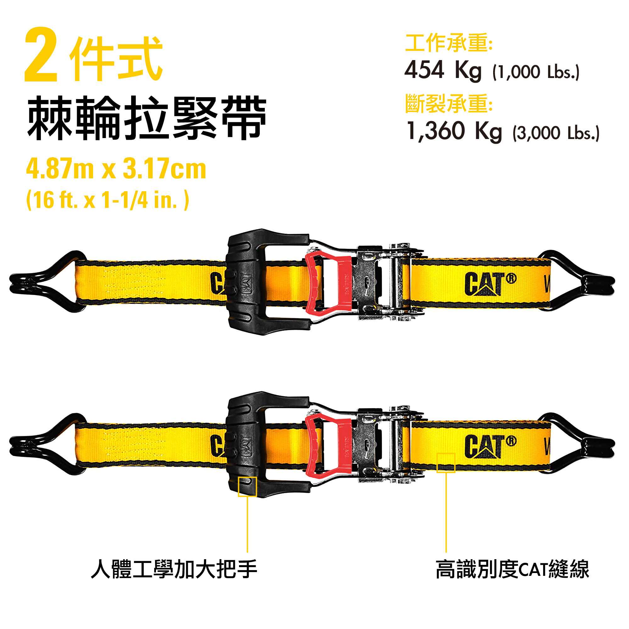 CAT® 兩件式棘輪綑綁拉緊帶採用 長約 4.87 公尺、寬約 3.17 公分的規格,具備 最大工作負載 450 公斤(約 1,000 磅)/斷裂強度 1,360 公斤(約 3,000 磅),專為嚴苛的工作任務與使用環境而設計與製造。不僅外觀專業,更同時提供卓越的強度、穩定性與操作便利性。