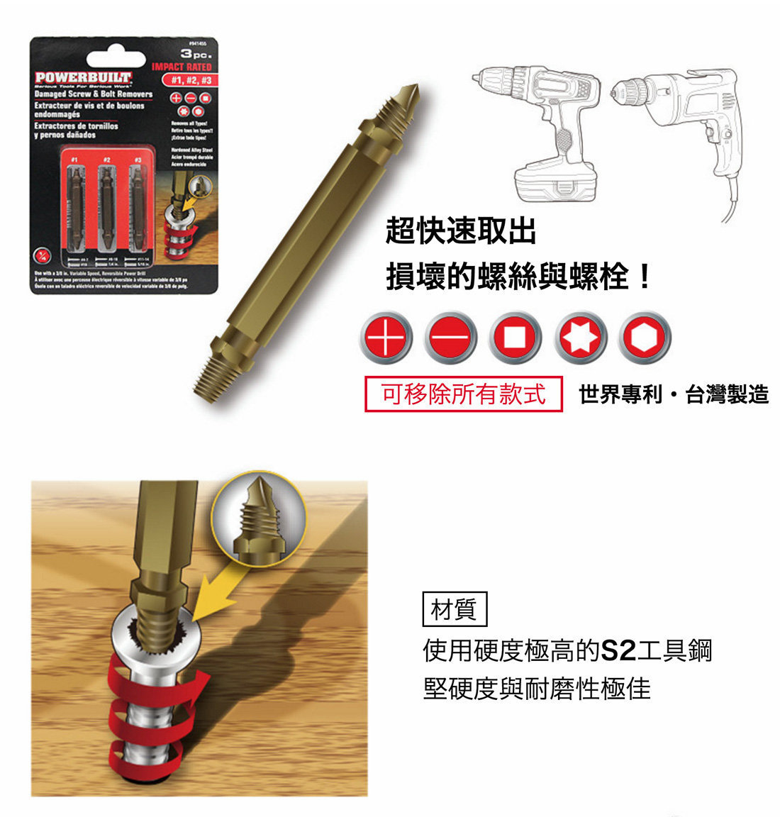 滑牙崩牙都難不倒我們的損壞螺絲取出器,接上電鑽後只要三個步驟就能輕鬆取出損壞的螺絲。