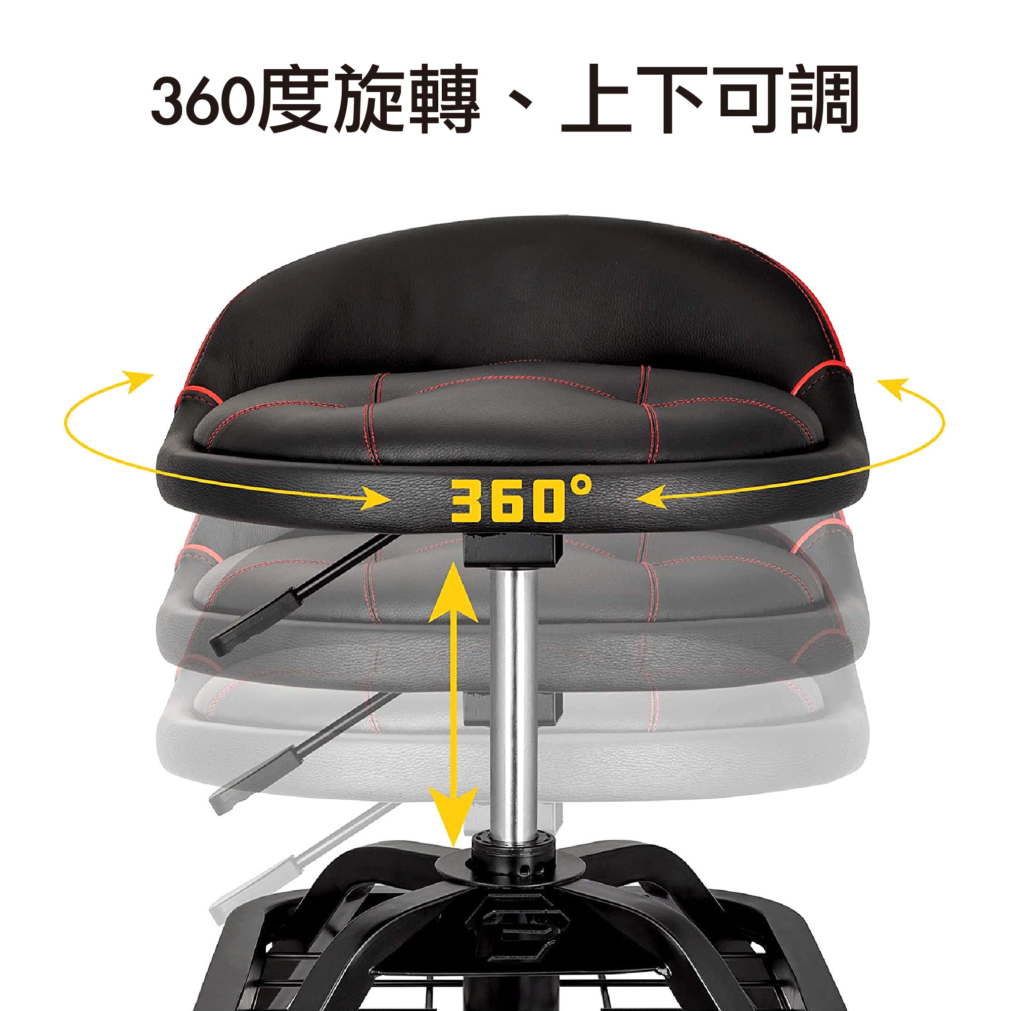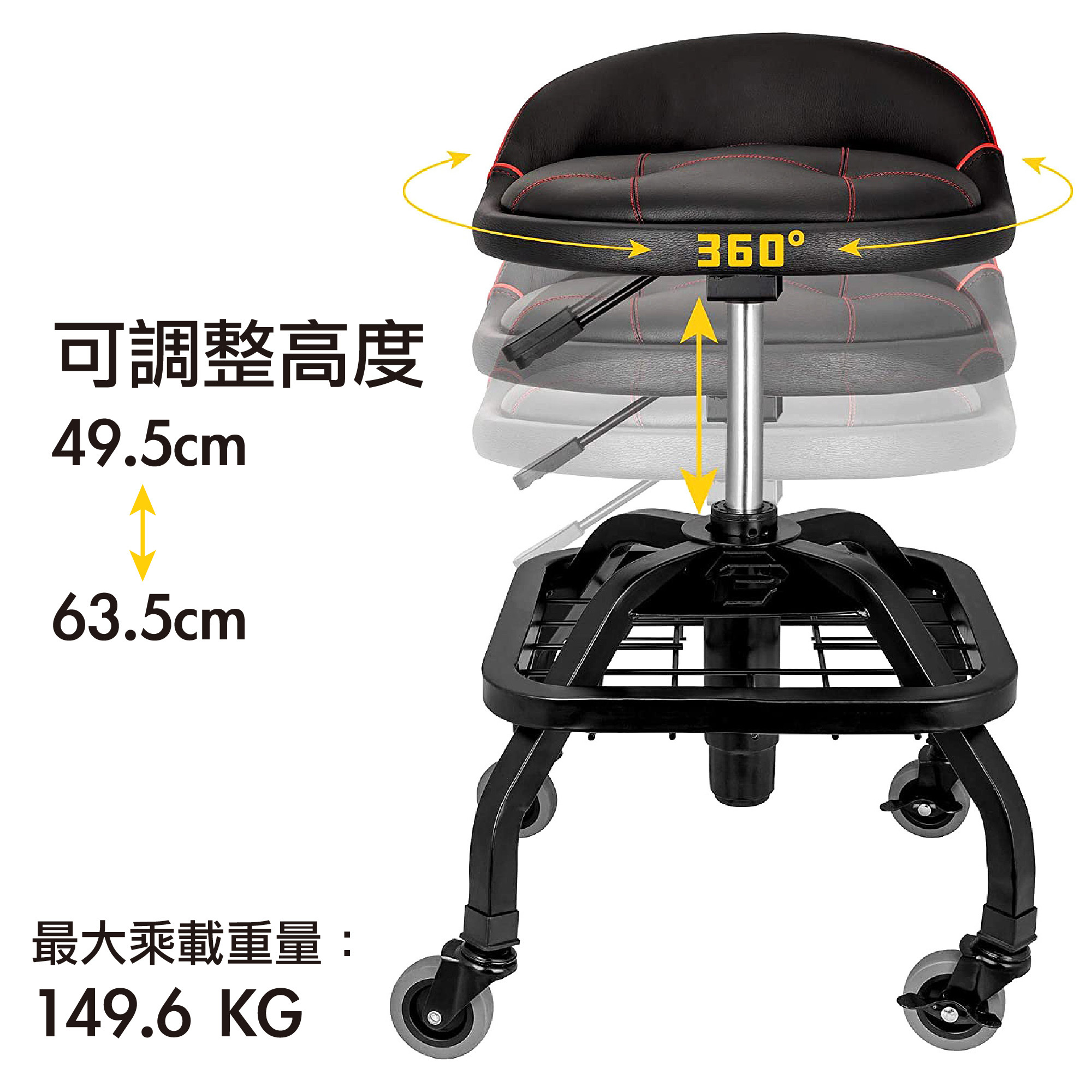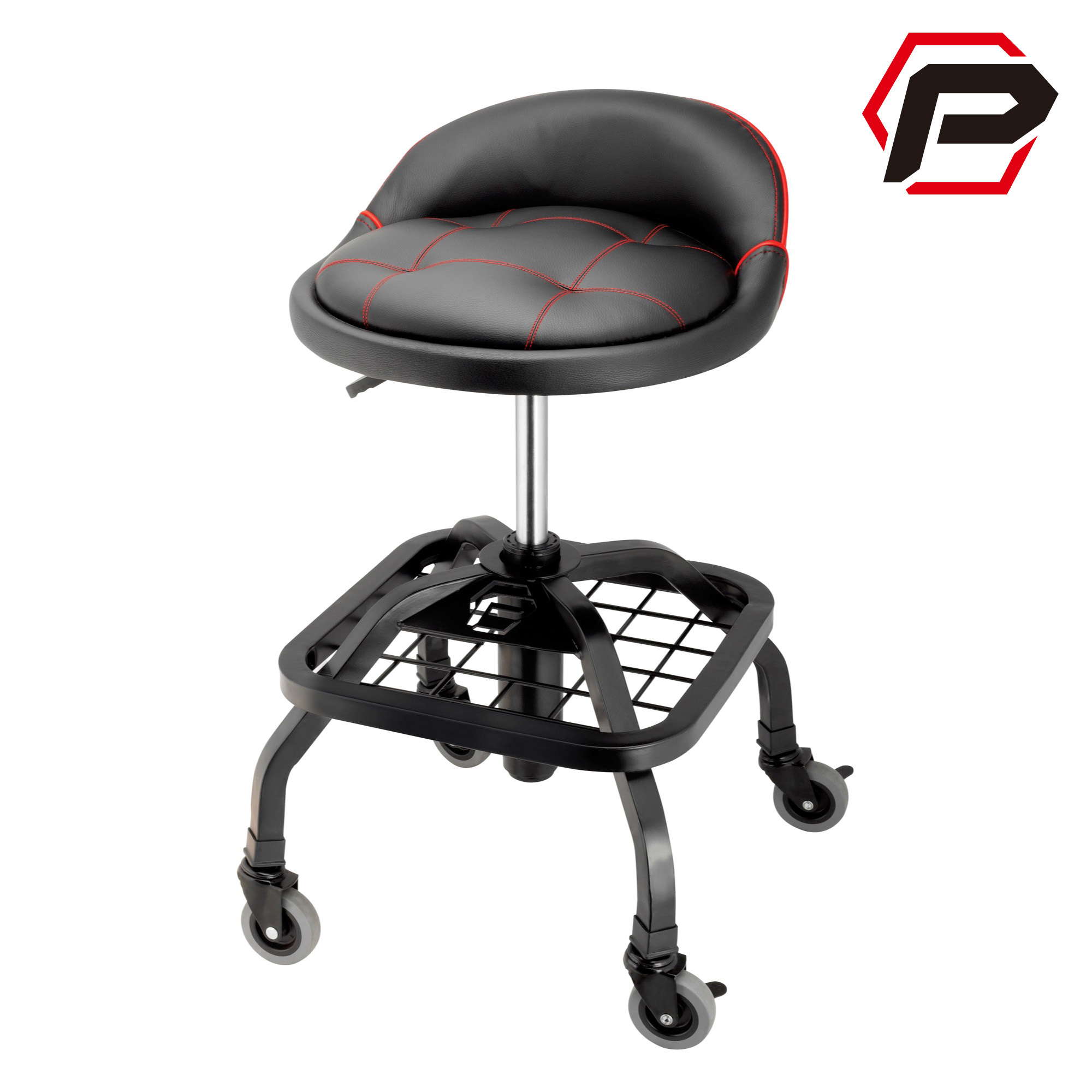 Powerbuilt 舒適工具椅由合金鋼方管底座構成,具有穩定和耐用特性,可乘載最重150公斤。座椅下方的網狀金屬架,設計用於存放常用工具與擺放較大物品。Powerbuilt 舒適工具椅使用氣壓升降系統,可調整高度於50公分至63公分內。帶煞車功能 4 個橡膠腳輪在瓷磚和木地板上滑動不會留下任何痕跡,並可以在任何堅硬表面上順暢移動。座椅腰靠設計大大提升乘坐時對臀部和下背部的支撐,有助於保持正確的姿勢,長時間工作不感到疲累。