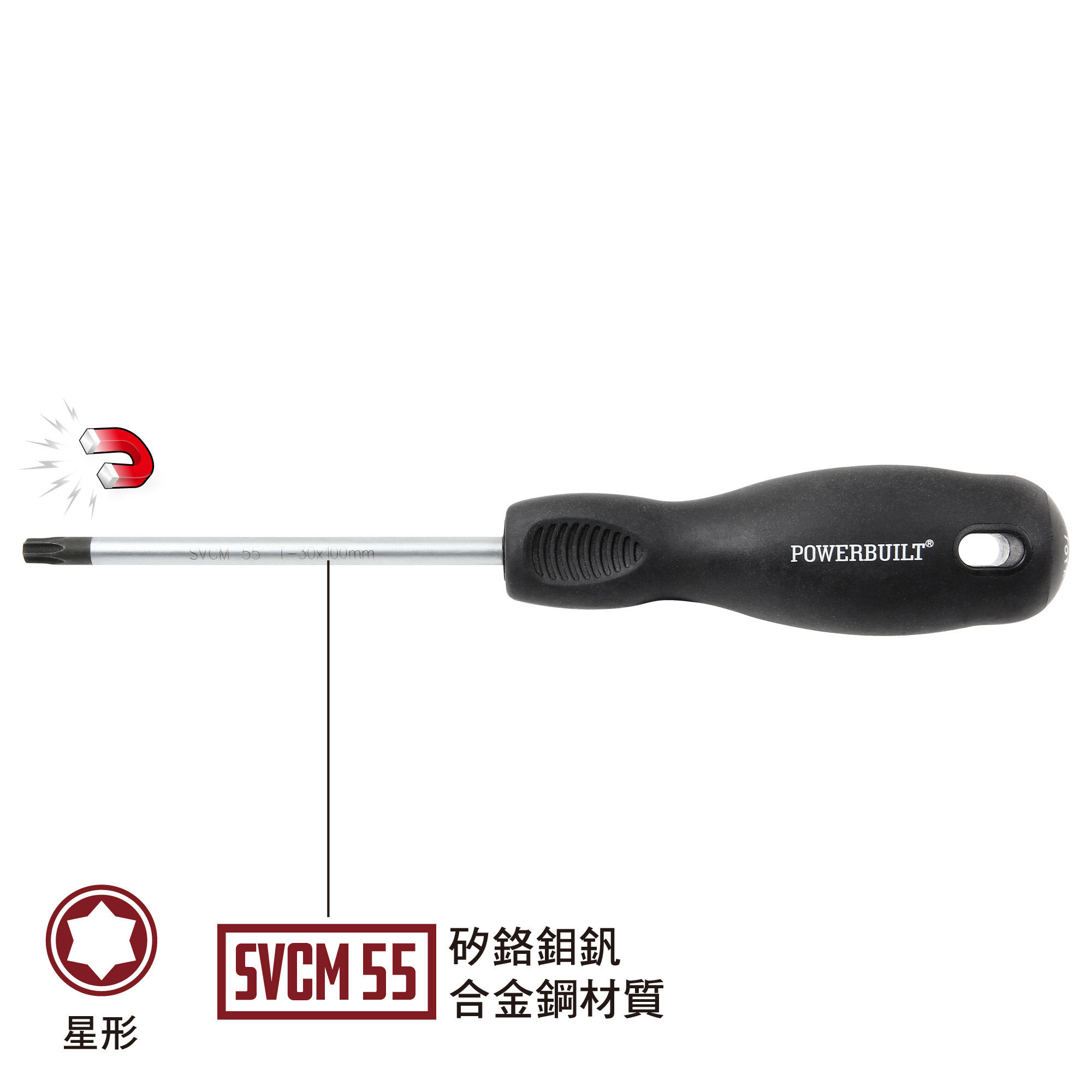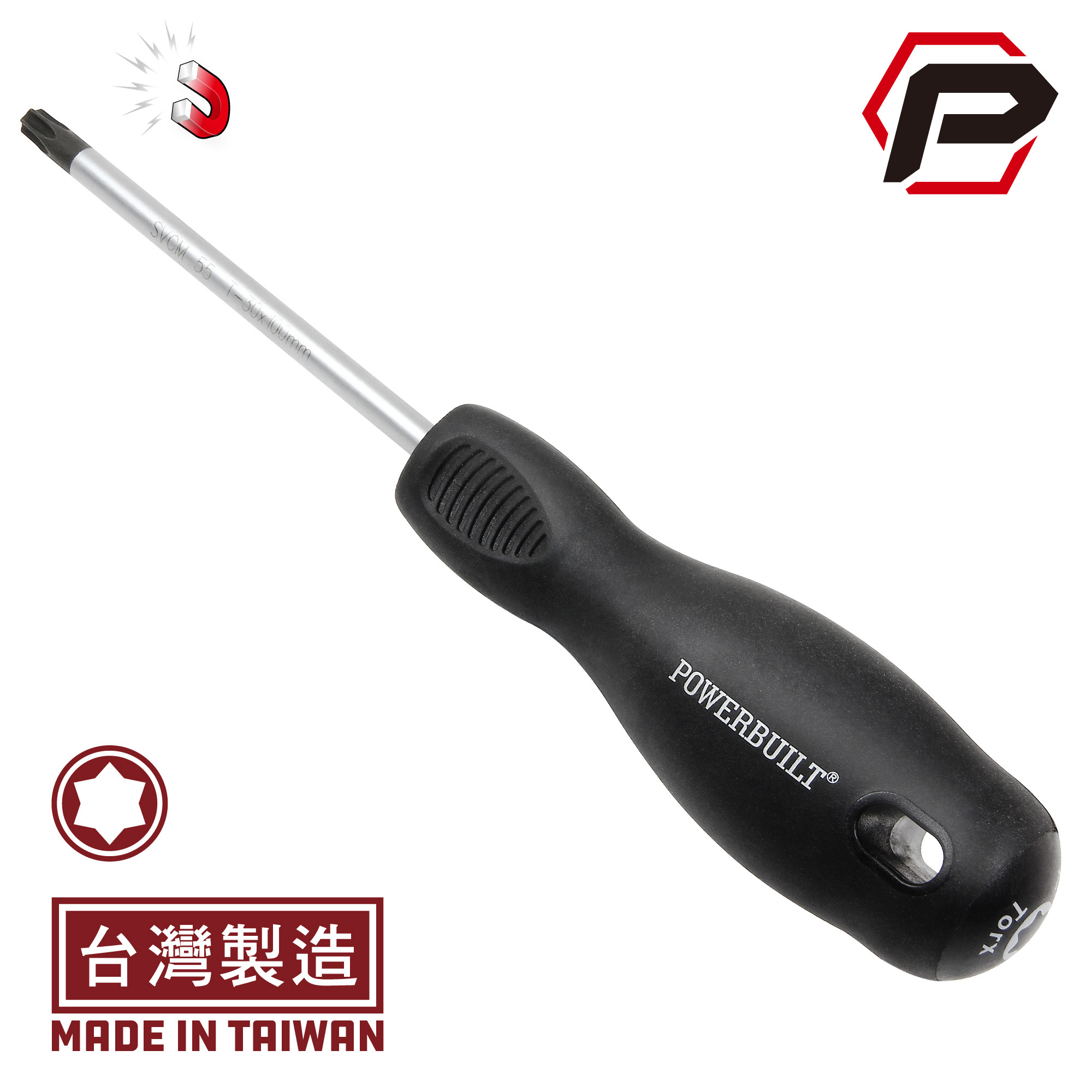 Powerbuilt寶力優工具星型螺絲起子為台灣製造,通過美國ANSI與歐洲DIN工具標準測試,品質保證,產品兩年保固。螺絲起子使用專利SVCM材質(矽、鉻、鉬、釩合金鋼)製造,耐用度和扭力表現與市售鉻釩鋼或碳鋼之螺絲起子比較,均有倍數的成長; 磁性螺絲起子頭,使用緊緊吸附螺絲或緊固件,特殊處理黑色螺絲起子頭部,可在擰緊或鬆開螺絲時防止打滑。手柄選用符合歐盟REACH認證的TPR材質,人體工學外型設計,提供舒適握感,大大提高工作效率。