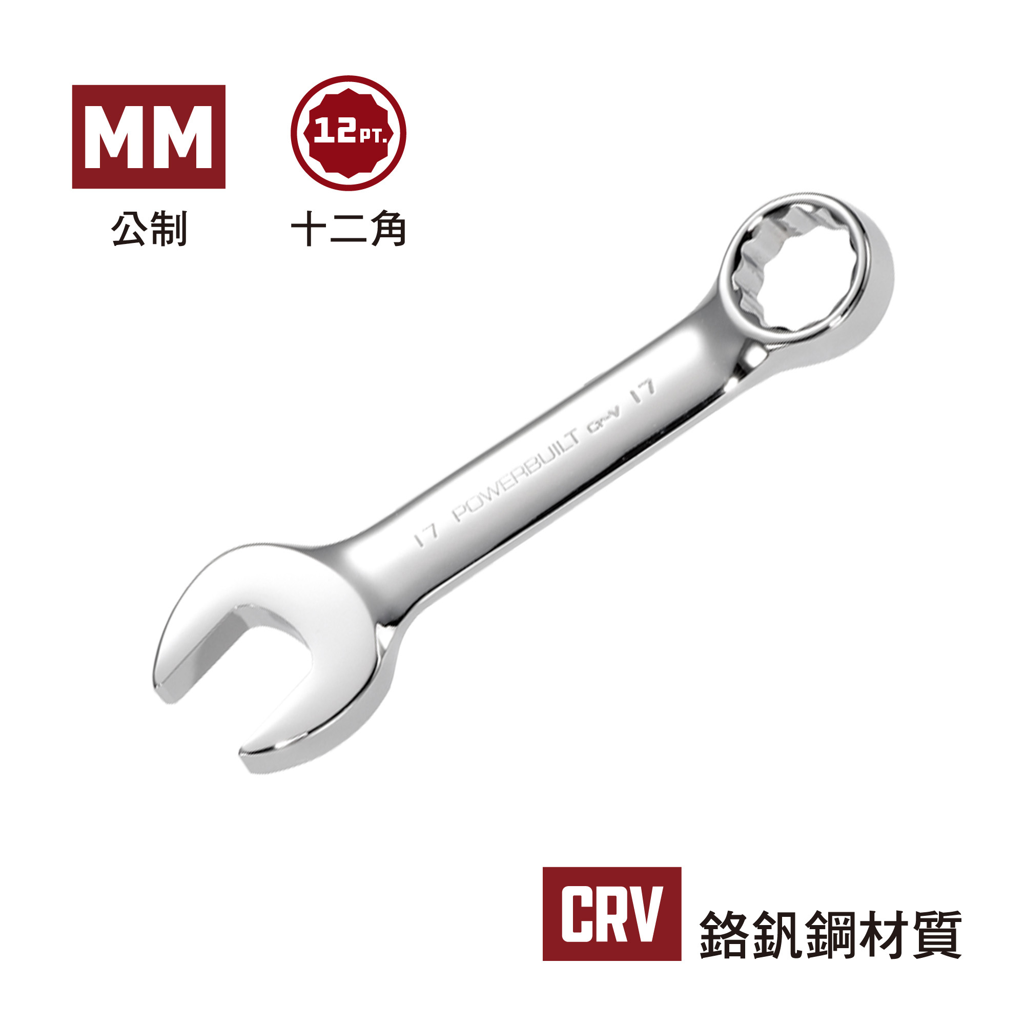 Powerbuilt寶力優工具短版梅開板手 ,為台灣製造,本體採用專業等級鉻釩合金鋼,兼具高硬度以及高韌性特性,並透過多道精密熱處理加工,使梅花開口板手可承受高扭力與超長壽命。板手表面採工業等級鏡面拋光鍍鉻處理,擁有抗刮耐磨以及抗油汙特性。板手採短版設計,更容易在狹小空間使用