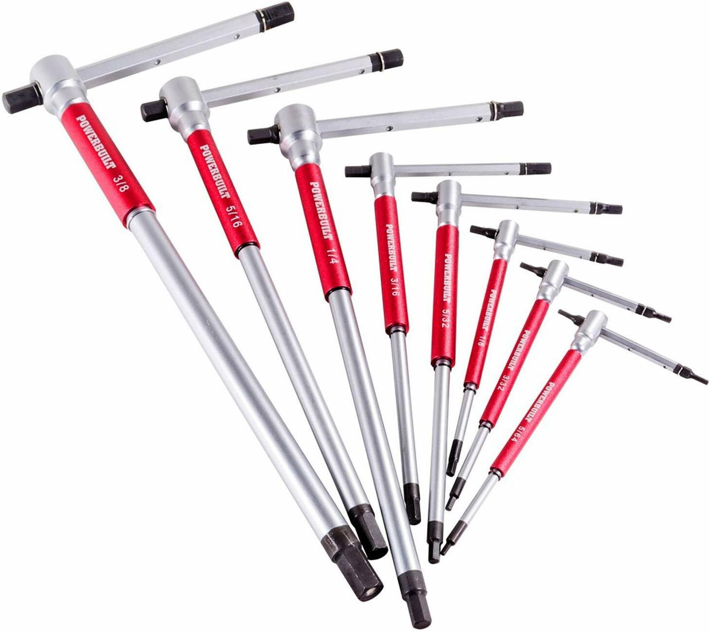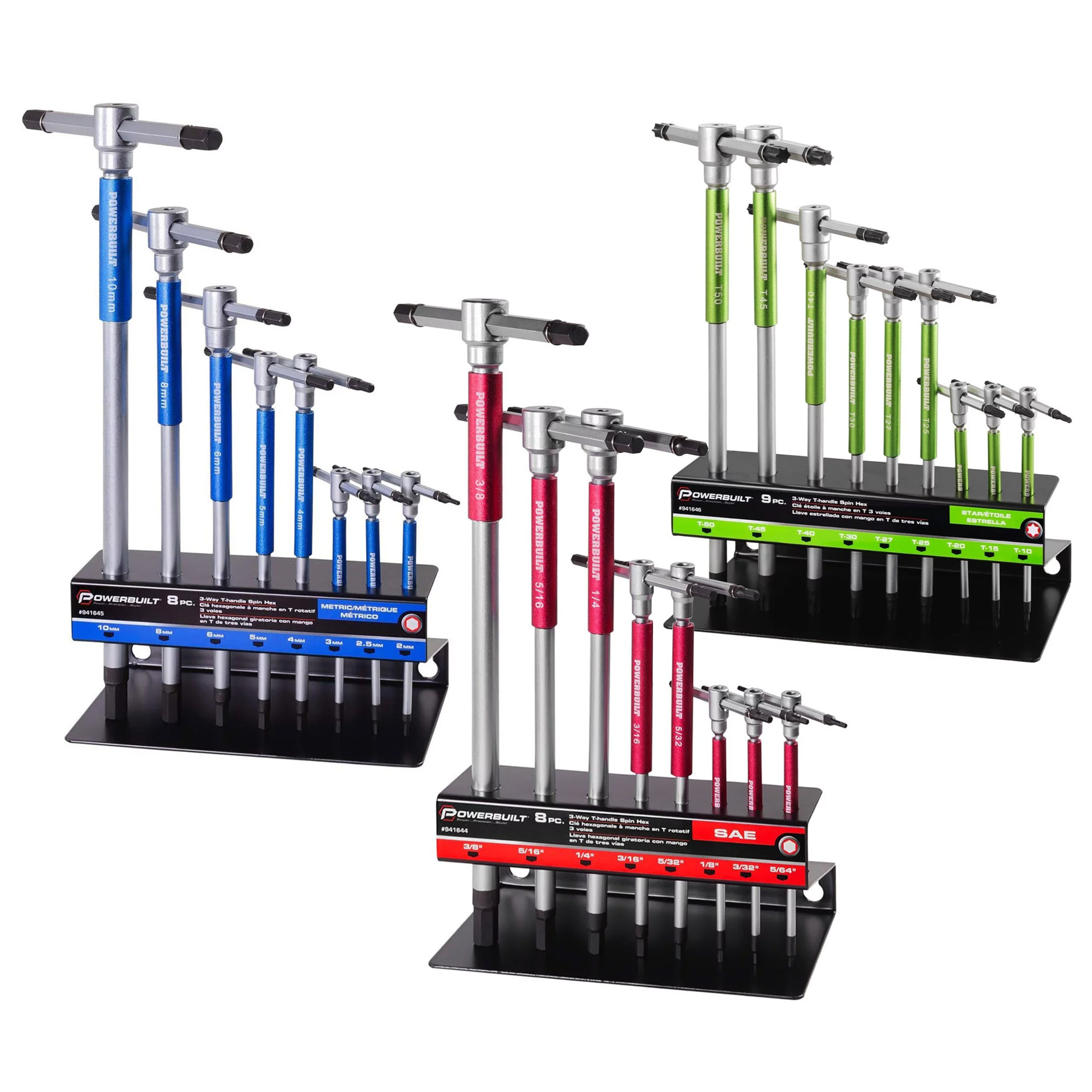 Powerbuilt寶力優工具T型板手採用鉻釩鋼製造,特殊鋁合金套柄,可以快速的轉動板手,輕易的鎖緊或鬆開六角螺絲。T型六角板手快脫轉換裝置,一秒變身L型板手。Powerbuilt寶力優工具專利三頭結構設計,使用起來更是無往不利。扳手附帶的存儲架,可將其固定在工作台上或掛在釘板上與工具箱中。