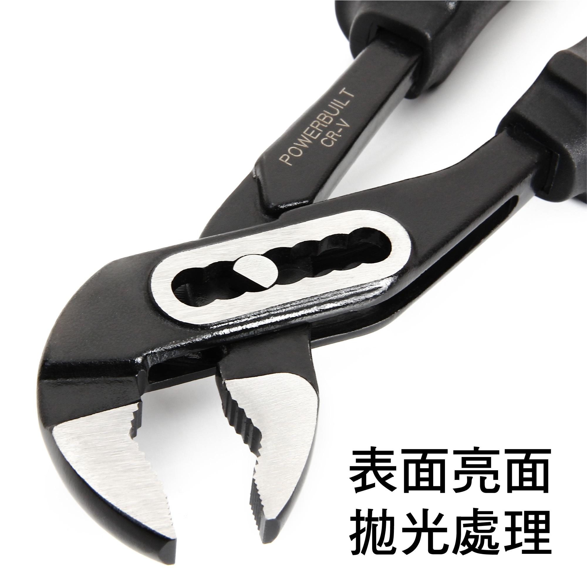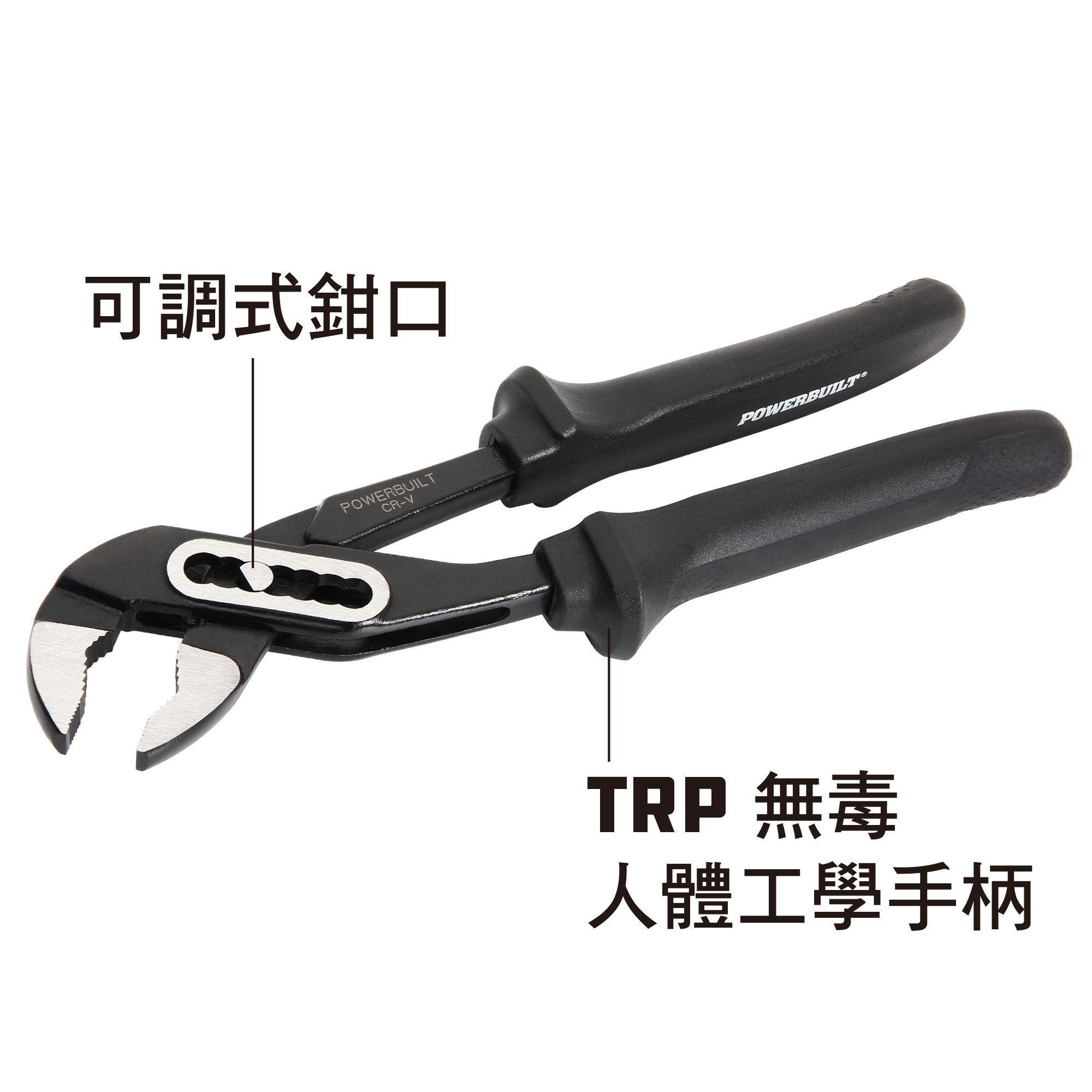 Powerbuilt寶力優工具水管鉗,產品為台灣製造,通過美國ANSI與歐洲DIN工具標準測試,品質保證,產品兩年保固。水管鉗選用工業等級鉻鉬合合金鋼材質,具有高硬度同時兼具高韌性特性,透過高週波處理以及精密多工序熱處理,精準控制鉗頭硬度達HRC58-61(鉗子本體硬度HRC42-47),使水管鉗咬合、夾持效果極強。水管鉗採用採符合人體工學的加大黑色TPR手柄,符合歐盟REACH環保規範,使用時不易滑落,更並且能減少長時間使用的疲勞感。