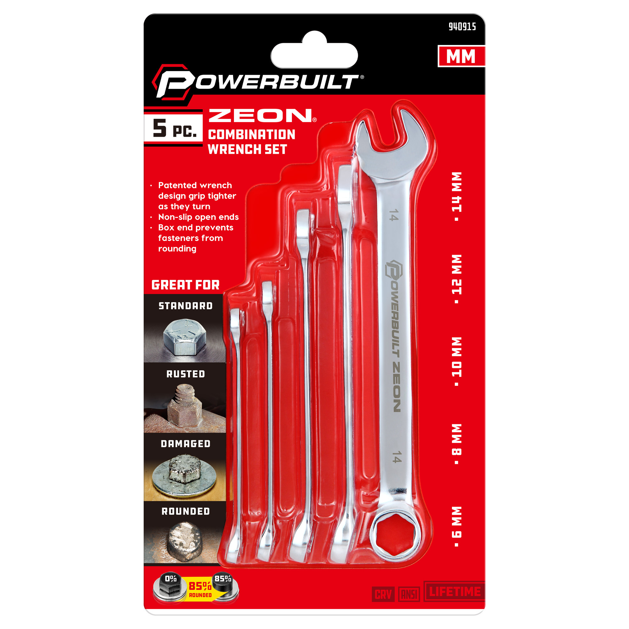 Powerbuilt寶力優工具 Zeon梅花開口板手組設計用於夾持和轉動損壞和滑牙的圓形六角螺帽。 Zeon板手組獲得全球專利的認證,可牢牢抓緊並且轉動圓角螺帽。換句話說,當六角頭螺帽損壞太嚴重而無法用普通的套筒或梅花板手轉動時, Zeon板手組可讓您速迅擺脫困境。Zeon梅花開口板手組同樣適用於全新或未損壞的緊固件與螺帽。Zeon梅花開口板手組使用最高等級鉻钒鋼、鍛造製成,展現極高的強度和耐用性。